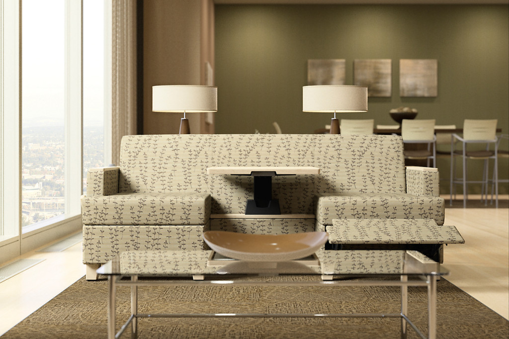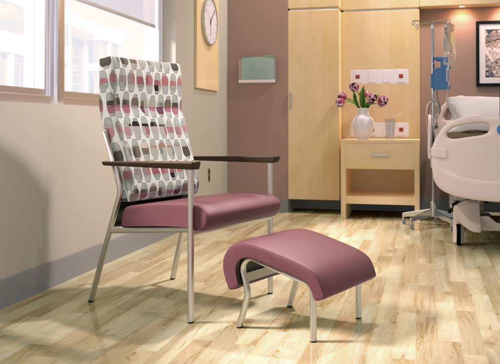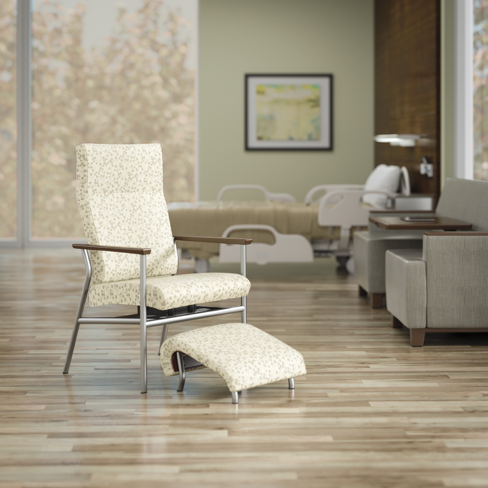 Hale Motion Chair, shown with Full Cap Arm Cap; Fabrics: Architex Divison Noble Square on back and Architex Happy Cloud Nine on seat and ottoman